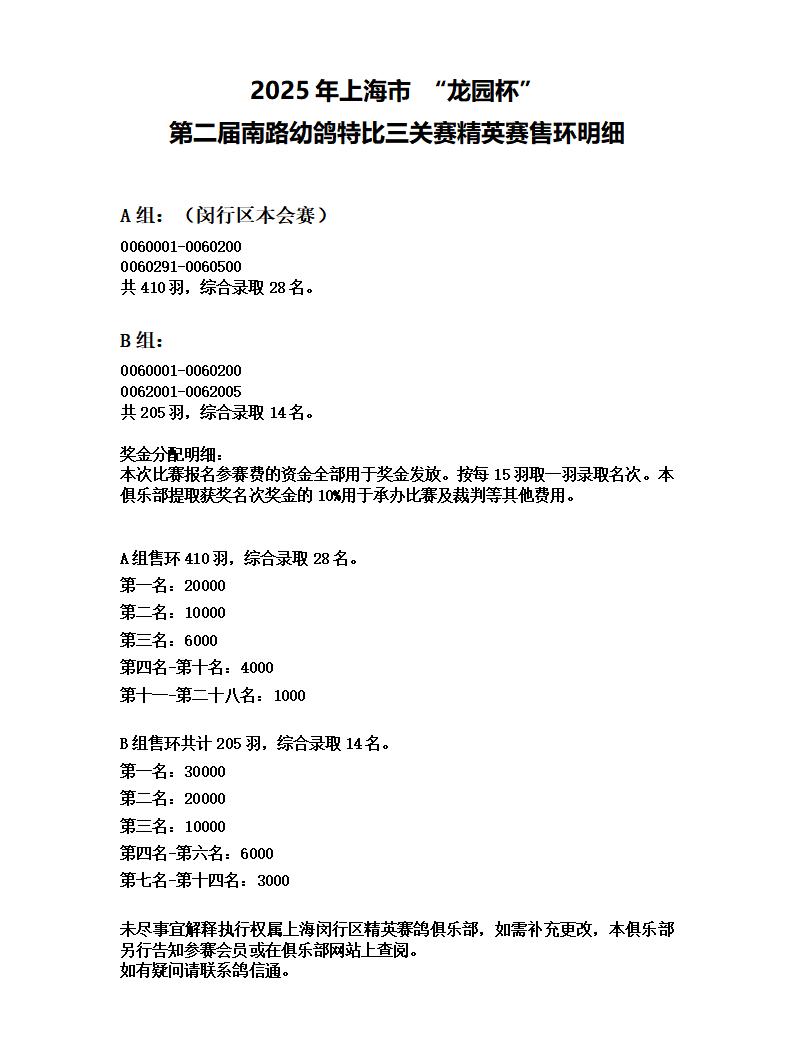 闵行区精英赛鸽俱乐部2025年“龙园杯”精英赛售环明细