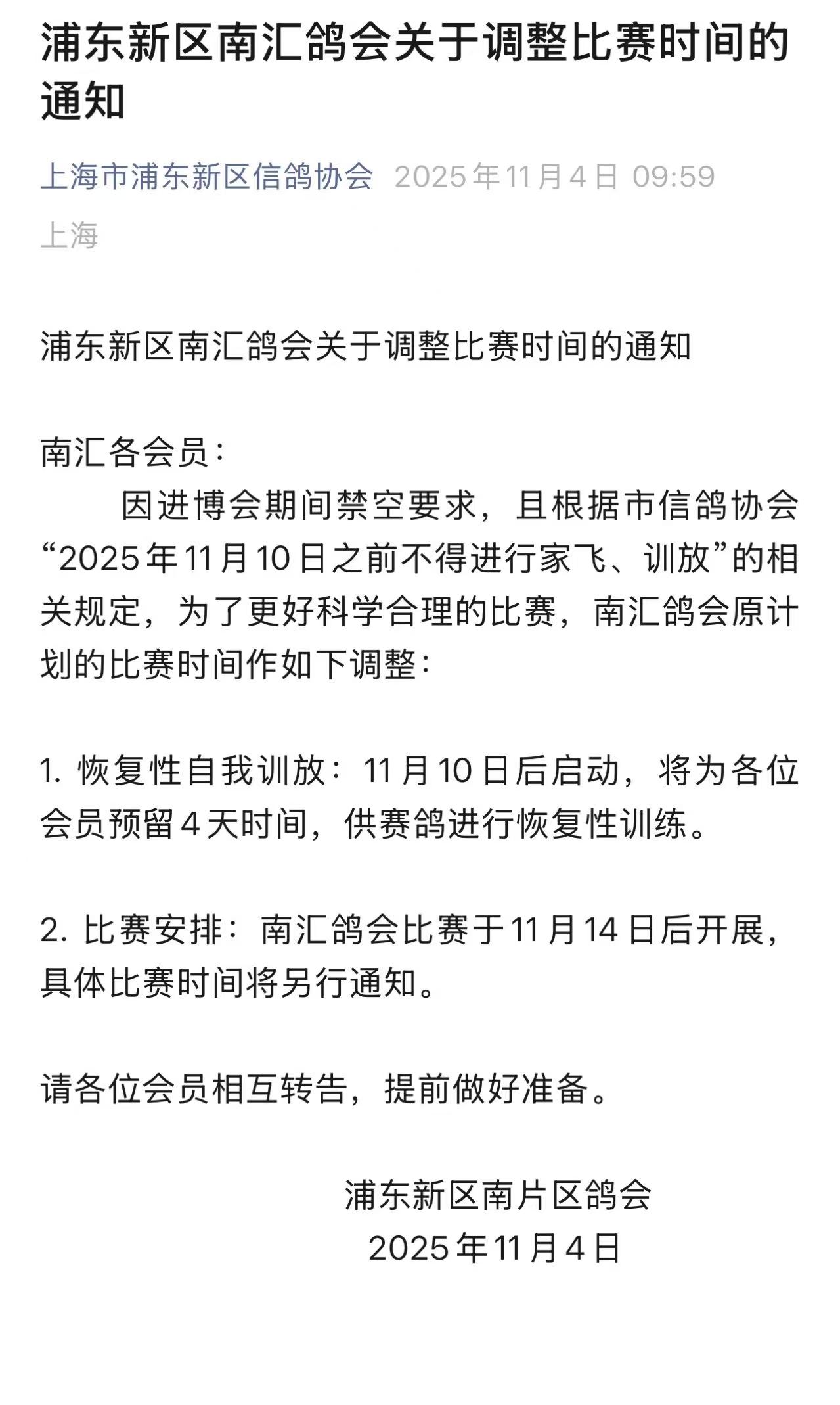 浦东新区南汇鸽会关于调整比赛时间的通知