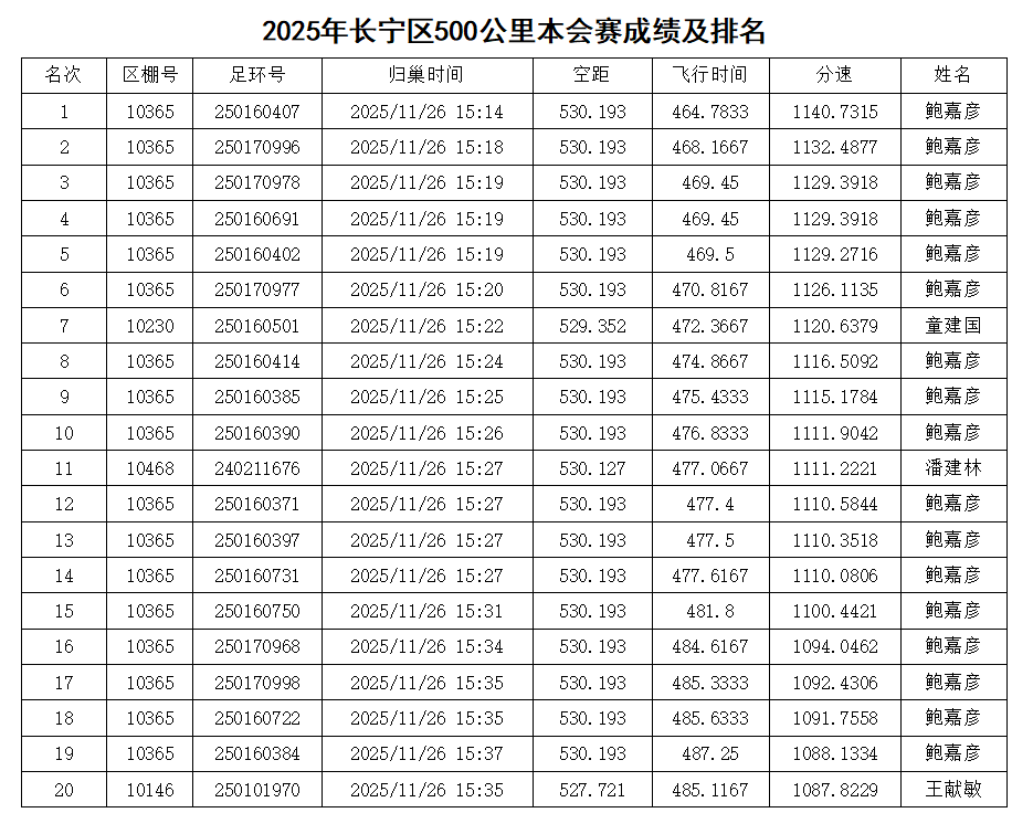 以下为长宁区500公里本会赛的成绩及排名,请及时确认。若有疑问,请于12月3日16:30前在长宁鸽会微信群内提出问题或建议。