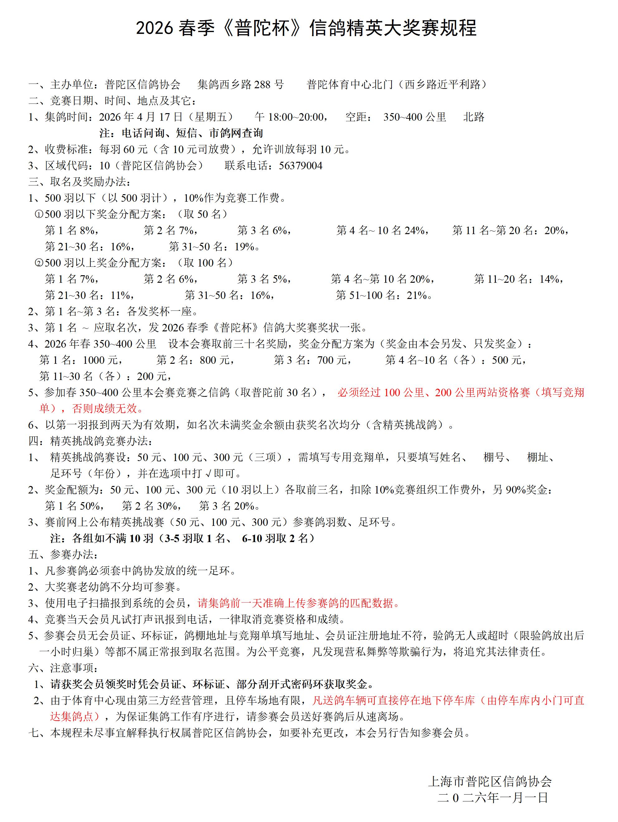 2026春季《普陀杯》信鸽精英大奖赛规程