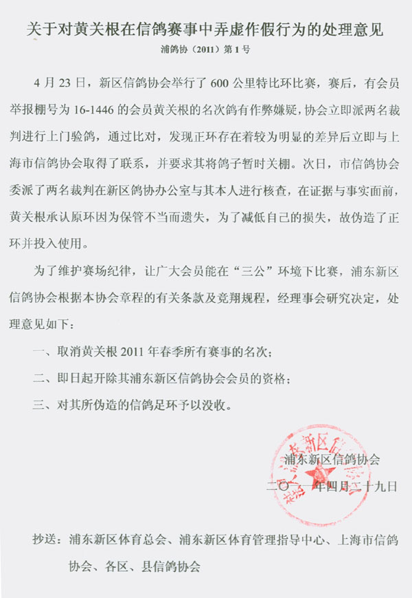 上海市信鸽协会同意浦东新区鸽协对黄关根会员伪造足环,弄虚作假行为的处理意见。为保持比赛的纯洁性,营造公平竞赛氛围,提高信鸽竞赛水平,必须加大对一切弄虚作假,干扰比赛正常进行的现象予以坚决打击,严肃处理。