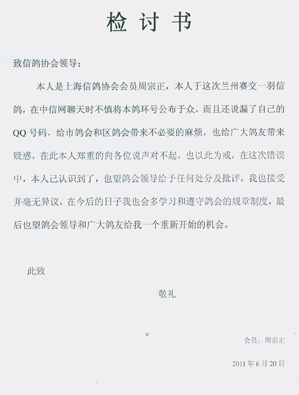我们希望周宗正会员认真吸取教训,也望广大会员引以为戒,认真执行竞赛规则、规程,营造文明、和谐、公平竞争的比赛氛围,净化、繁荣信鸽竞赛市场,促进信鸽运动健康、有序发展。