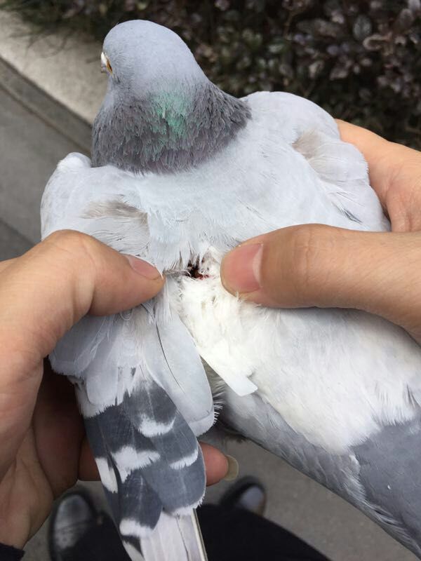 3月8日下午,家住上海静安区的吴轩波女士在小区的花坛边上,发现了一羽受伤的灰色鸽子正趴在地上无法动弹,由于此地是车辆进出要道,她当即与门卫保安小张一起边驱赶在一旁虎视眈眈的野猫,边小心翼翼地捧起鸽子,见其腿上分别佩戴着两个有编号的足环(CHN2014-09-409998),便知这是一羽能参加比赛的信鸽。经查看,此鸽背部有严重的外伤,吴女士心中很是怜悯和焦急,便马上送到了附近的宠物医院进行救治。在经过了X光拍片和伤口消炎缝针处理后,她见信鸽的精神状态尚可,便支付了400多元的治疗费后,把鸽子带回家,还专门去超市买了小米喂养。当天晚上,吴女士在微信朋友圈里发出消息,打听是否有人能帮助寻找信鸽的主人。让她失望的是,除了有人调侃介绍如何食用鸽子的方法外,寻主之事竟一无所获。