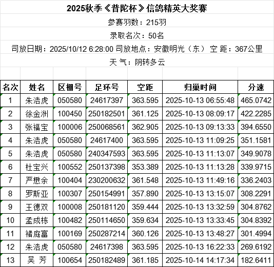 2025年秋季《普陀杯》信鸽精英大奖赛